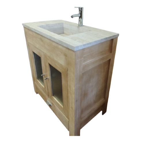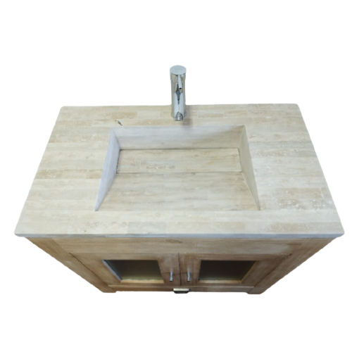 Vanitory de madera laqueada con Bacha de piedra travertina con desagüe escondido.